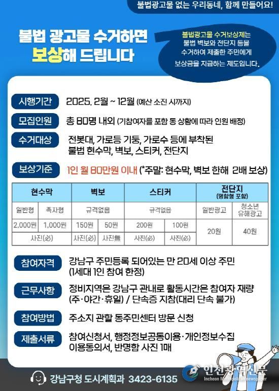 [인천광역신문] 최훈 기자 | 꿈이 모이는 도시, 미래를 그리는 강남구가 불법 유동광고물 근절을 위해 운영 중인 ‘수거보상제’의 참여 인원을 대폭 확대한다. 구는 주민 약 60명을 새롭게 모집해 더 많은 주민이 직접 거리 정비에 나설 수 있도록 했다.