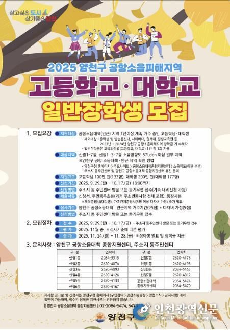 한편, 양천구는 공항소음 피해지역 학생들의 학습권 보호와 피해보상 대책의 일환으로 장학금 제도를 운영해오고 있으며, 현재까지 총 1,700여 명에게 약 25억 원의 장학금을 지원했다.