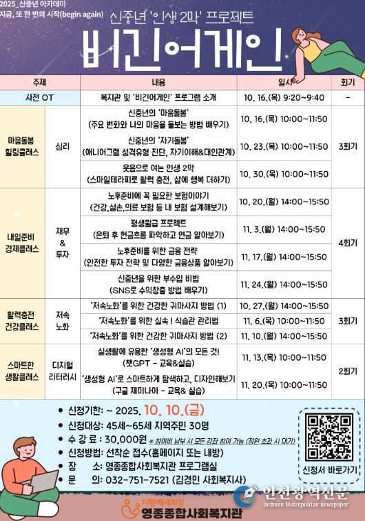[인천광역신문] 최예준 기자 | 인천 중구 영종종합사회복지관은 오는 10월 16일부터 11월 24일까지 45세~65세 지역 주민을 대상으로 신중년 아카데미 ‘비긴어게인’을 운영한다고 밝혔다.