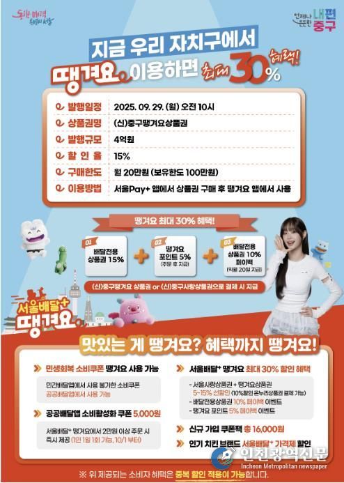 [인천광역신문] 최훈 기자 | 서울 중구가 오는 29일 오전 10시, 총 4억원 규모의 ‘(신)중구땡겨요상품권’을 발행한다.