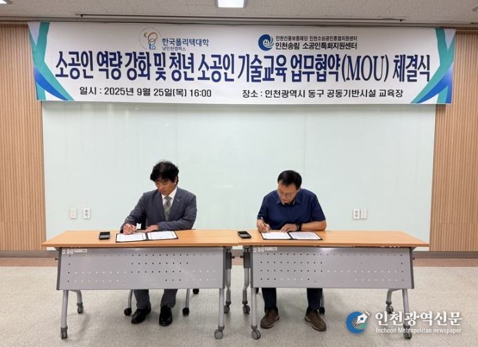 [인천광역신문] 최예준 기자 | 인천광역시는 9월 25일 인천송림 소공인특화지원센터에서 ‘소공인 역량 강화 및 청년 소공인 기술교육 지원을 위한 업무협약(MOU)’을 체결했다고 밝혔다.