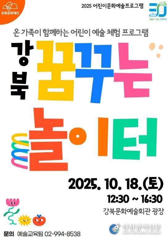 [인천광역신문] 최훈 기자 | 서울 강북문화재단은 오는 10월 18일 강북문화예술회관 광장에서 문화의 날을 맞아 세대 간 소통과 가족 간 유대감을 다질 수 있는 체험형 축제 ‘강북 꿈꾸는 놀이터’를 개최한다.