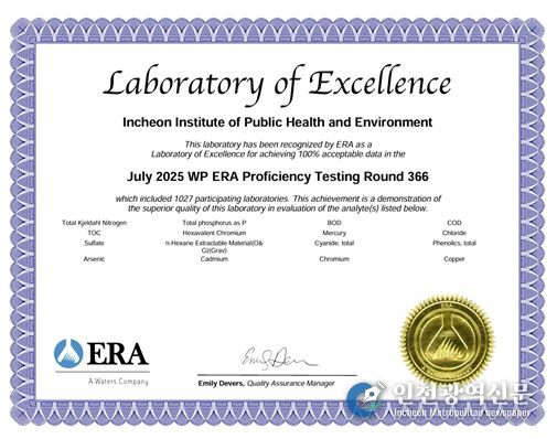 [인천광역신문] 최예준 기자 | 인천광역시 보건환경연구원은 미국 환경자원협회(ERA)가 주관한 2025년 환경분야 국제숙련도 평가에서 ‘최우수 등급(Laboratory of Excellence)’을 받았다고 밝혔다.
