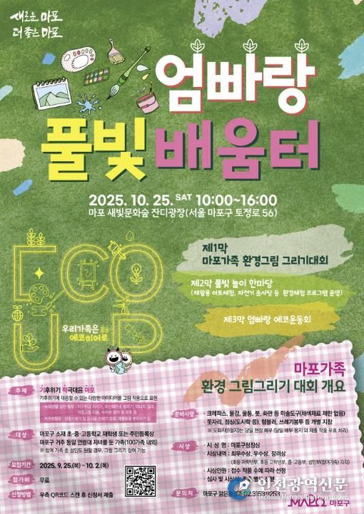 ‘마포 엄빠랑 풀빛배움터’는 마포새빛문화숲 잔디광장(토정로 56)에서 10월 25일 오전 10시부터 열리며, ‘우리 가족은 에코 히어로’라는 부제로 진행될 예정이다.