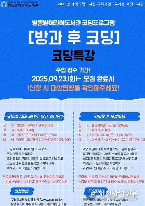 [인천광역신문] 최예준 기자 | 인천 계양구립별똥별어린이도서관은 2025년부터 실시된 초·중등학교 코딩교육 의무화에 따라 지역 아동들의 디지털 역량 강화를 위해 10월부터 코딩 특화사업 ‘방과 후 코딩’을 운영한다고 밝혔다.