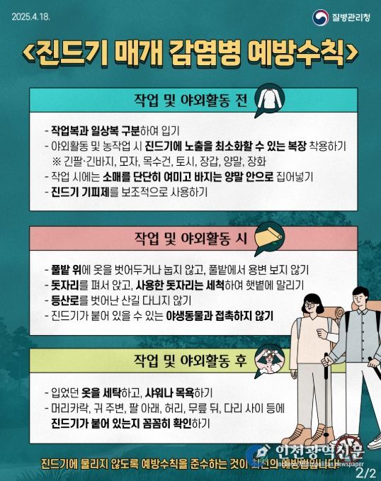 또한, “진드기매개감염병을 예방하기 위한 최선의 방법은 진드기에 물리지 않는 것이며, 야외활동 후 2주 이내 발열, 구토, 설사 등 증상이 나타나면 즉시 의료기관을 방문하여 농작업 등 야외활동력을 알리고 진료받을 것을 당부드린다”고 전했다.