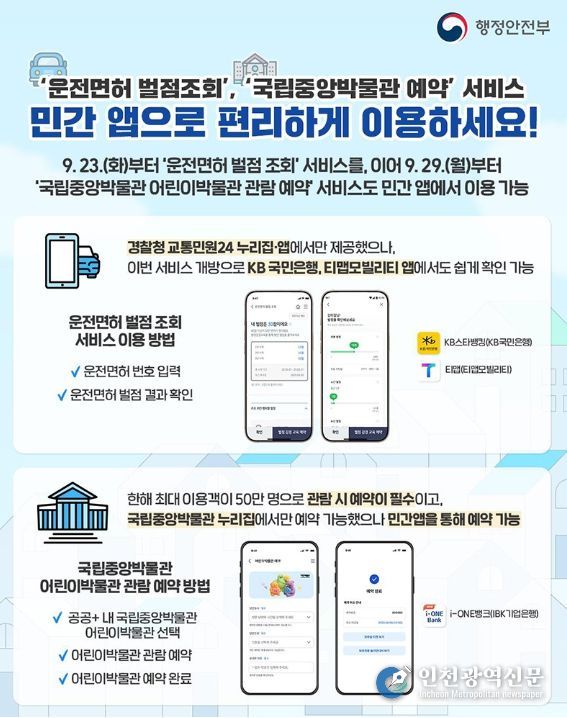 [인천광역신문] 관리자 기자 | 9.23.(화)부터 '운전면허 벌점 조회' 서비스를, 이어 9.29.(월)부터 '국립중앙박물관 어린이박물관 관람 예약' 서비스도 민간 앱에서 이용 가능
