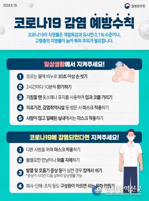 [인천광역신문] 관리자 기자 | 질병관리청은 병원급 의료기관의 주간 코로나19 입원환자 수는 지난주 대비 증가하지 않았으나, 여전히 높은 수준으로 발생하고 있고, 추석 연휴 기간은 대규모 이동과 모임이 많을 시기인 만큼 코로나19 예방을 위해 각별한 주의가 필요하다고 당부했다.