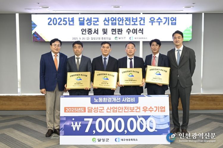 달성군은 대구상공회의소와 공동으로 지난 26일 ‘2025년 달성군 산업안전보건 우수기업 인증서 및 현판 수여식’을 개최하고, 안전한 일터 만들기에 솔선수범한 관내 4개 기업에 인증서와 현판을 전달했다.