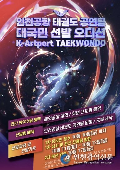 [인천광역신문] 최예준 기자 | 인천국제공항공사는 인천공항에서 진행되는 태권도 상설공연인 ‘2025-2026 인천공항 태권도 상설공연’에 참여할 태권도 전문 공연팀을 공개 모집한다고 28일 밝혔다.