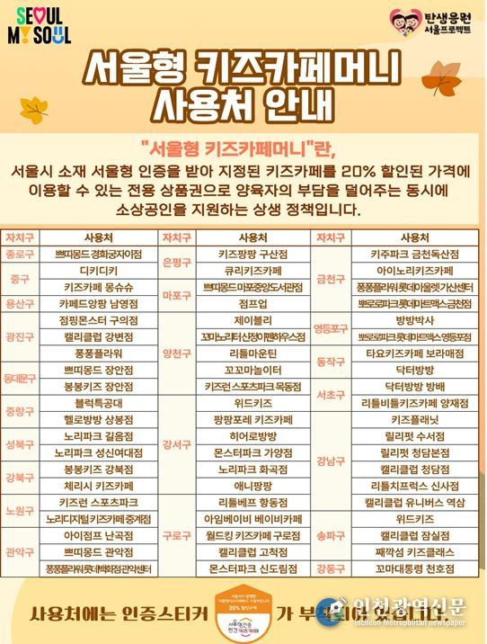[인천광역신문] 최훈 기자 | 열흘 안팎의 긴 추석연휴를 앞두고 아이들과 양육자가 보다 부담 없는 가격으로 키즈카페에서 즐거운 연휴를 보낼 수 있도록 서울시가 20% 할인 혜택이 있는 ‘서울형 키즈카페머니’ 11억 원을 추가 발행한다고 밝혔다.