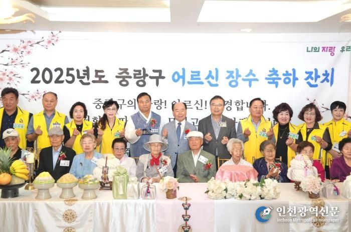 [인천광역신문] 관리자 기자 | 중랑구는 지난 9월 26일, 중랑구 효사랑봉사회 주관으로 ‘2025년 중랑구 어르신 장수 축하 잔치’를 열고 동별 최고령 어르신과 가족들을 초청해 감사의 마음을 전하는 뜻깊은 시간을 가졌다.