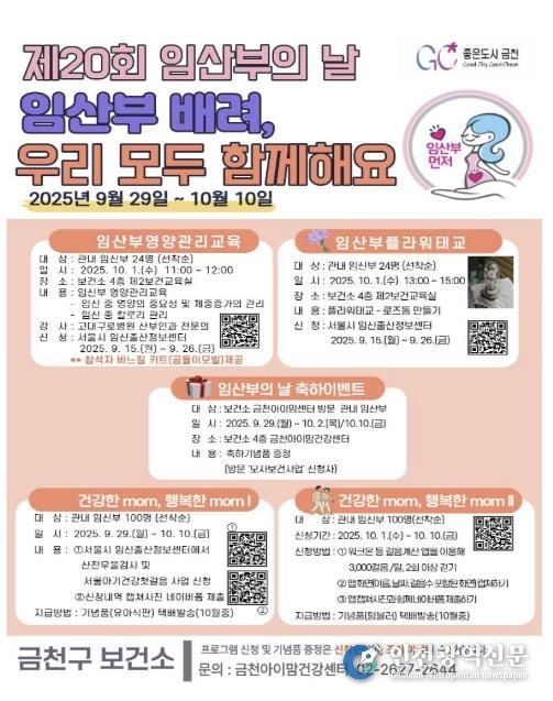 [인천광역신문] 최훈 기자 | 금천구는 제20회 ‘임산부의 날’을 맞아 9월 29일부터 10월 10일까지 기념행사를 운영한다고 밝혔다.