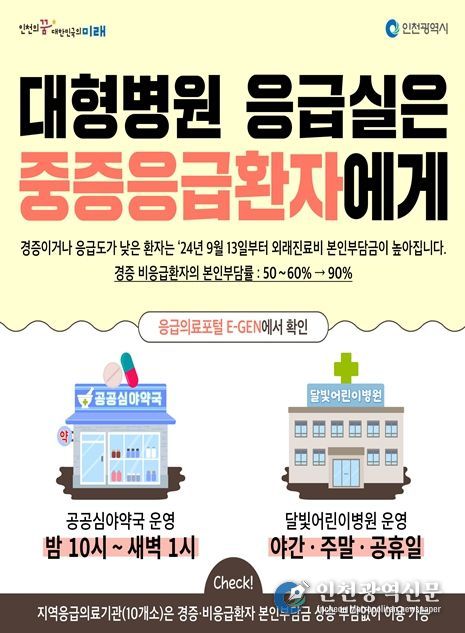 [인천광역신문] 최예준 기자 | 인천광역시는 추석 연휴를 맞아 의료공백을 최소화하고 응급 상황에 신속히 대응하기 위해 시 및 군·구 보건소에 응급진료상황실을 운영하고, 응급의료기관·병의원·약국 등을 중심으로 비상 진료체계를 본격 가동한다고 밝혔다.