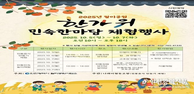 [인천광역신문] 최예준 기자 | 인천광역시 월미공원사업소는 오는 10월 5일부터 7일까지 3일간 월미공원 내 전통정원(양진당)에서 ‘한가위 민속한마당 체험행사’를 개최한다고 밝혔다.