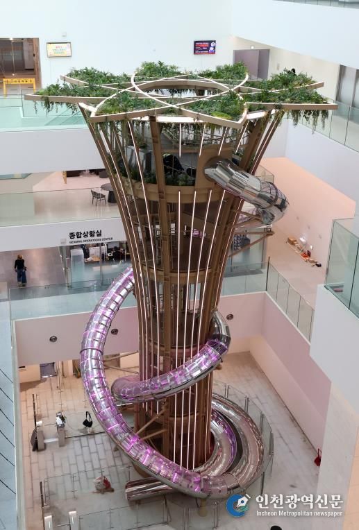 먼저 ‘놀거리’는 신청사 중정에 설치된 높이 15m의 초대형 미끄럼틀(슬라이드)이다. 운영을 시작한 지 20일 만에 6천여 명이 다녀갈 정도로 이미 시민들에게 큰 인기를 얻고 있다.
