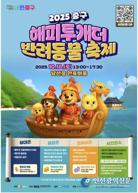 [인천광역신문] 최훈 기자 | 서울 중구는 오는 10월 18일 오후 1시부터 5시 30분까지, 남산골 한옥마을에서‘2025 해피투개(dog)더’ 반려견 축제를 연다. 올해로 3회째를 맞이한 이번 축제는 ‘충무공 이순신 탄생지, 중구’의 의미를 더해 용맹과 지혜, 교감을 담은 다채로운 프로그램으로 꾸렸다.