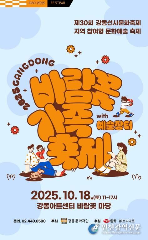 [인천광역신문] 최훈 기자 | 강동문화재단은 오는 10월 18일 오전 11시부터 오후 5시까지, 강동아트센터 바람꽃마당에서 '2025 강동 바람꽃 가족 축제 · 예술장터'를 개최한다고 밝혔다.