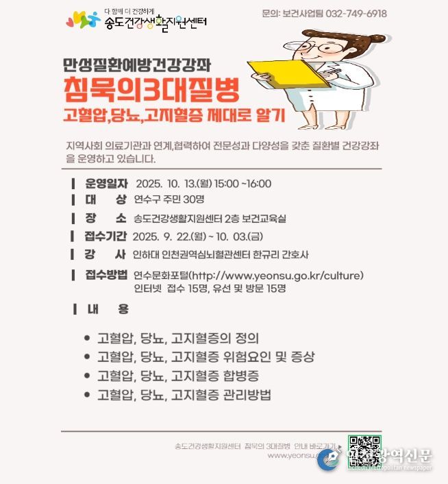 [인천광역신문] 최예준 기자 | 연수구 송도건강생활지원센터는 오는 10월 13일 지역 주민을 대상으로 무료 건강 강좌 ‘침묵의 3대 질병: 고혈압, 당뇨, 고지혈증 제대로 알기’를 진행한다.
