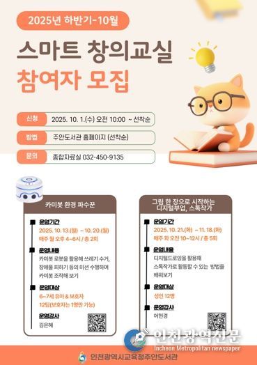 [인천광역신문] 최예준 기자 | 인천광역시교육청주안도서관은 10월 1일 오전 10시부터 ‘10월 스마트창의교실’ 참여자를 모집한다.
