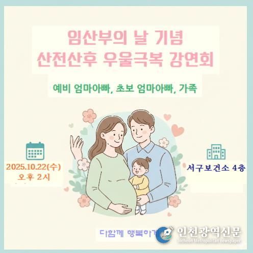 [인천광역신문] 최예준 기자 | 인천 서구는 ‘제20회 임산부의 날’을 기념하여 임산부와 가족을 위한 ‘산전·산후 우울증 극복’이라는 주제로 서구보건소에서 특별 강좌를 개최한다고 밝혔다.