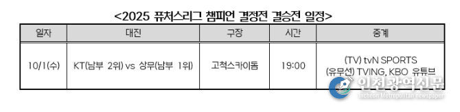 퓨처스리그 초대 챔피언이 결정될 결승전은 10월 1일(수) 오후 7시 고척스카이돔에서 열리며, 결승전은 TVING과 tvN SPORTS 및 KBO 유튜브를 통해 중계된다.