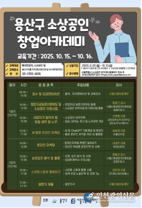 [인천광역신문] 최훈 기자 | 서울 용산구가 서울신용보증재단과 함께 예비창업자와 소상공인의 성공적인 창업 지원을 위한 ‘2025 하반기 창업아카데미’를 개최한다.