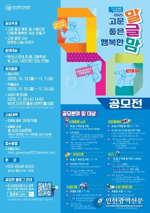 [인천광역신문] 관리자 기자 | 부산광역시교육청은 언어문화를 개선하고 배려와 존중의 문화를 확산시키기 위해 부산시 관내 초·중·고등학생 및 교사, 시민을 대상으로 고운 말 좋은 글 행복한 맘'말글맘'공모전을 개최한다.