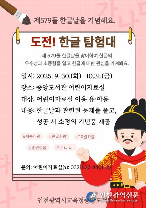 [인천광역신문] 최예준 기자 | 인천광역시교육청중앙도서관은 제579돌 한글날을 맞아 9월 30일부터 10월 31일까지 어린이들이 즐겁게 한글을 배우고 도서관을 체험할 수 있는 특별행사 ‘도전! 한글 탐험대!’를 운영한다.