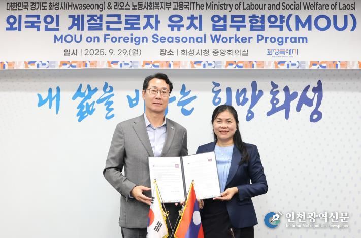 [인천광역신문] 관리자 기자 | 화성특례시가 지난 29일 라오스 노동사회복지부 고용국(The Minisry of Labour and Social Welfare of Laos)과 외국인 계절근로자 유치 업무협약(MOU)을 체결했다.