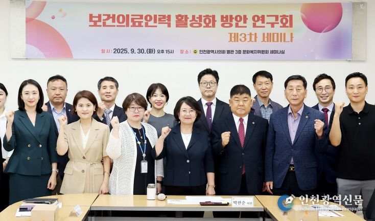 [인천광역신문] 최예준 기자 | 인천광역시의회 의원연구단체인 ‘보건의료인력 활성화 방안 연구회’는 30일 문화복지위원회 세미나실에서 박판순 대표의원(국·비례)을 비롯해 박창호(국·비례)·이봉락(국·미추홀구3) 의원, ‘의료기사단체 정책연구단’관계자 등이 참석한 가운데 ‘제3차 정책 세미나’를 개최했다.