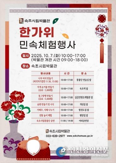 [인천광역신문] 관리자 기자 | 속초시립박물관은 귀성객과 관광객들이 추석의 의미를 되새기고 세대가 함께 어울릴 수 있도록 ‘한가위 민속체험행사’를 개최한다.
