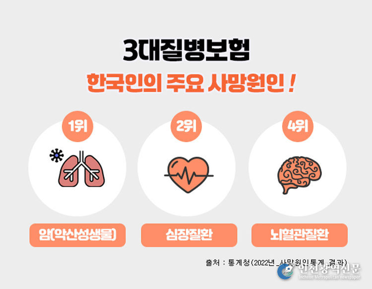 [인천광역신문] 관리자 기자 | 3대질병으로 일컬어지는 암, 뇌혈관질환, 심혈관질환은 한국인의 주요 사망원인에서 상위를 차지하고 있으며, 이에 대한 진단비를 집중적으로 보장해 주는 보험상품을 3대질병진단비 보험이라 할 수 있다.