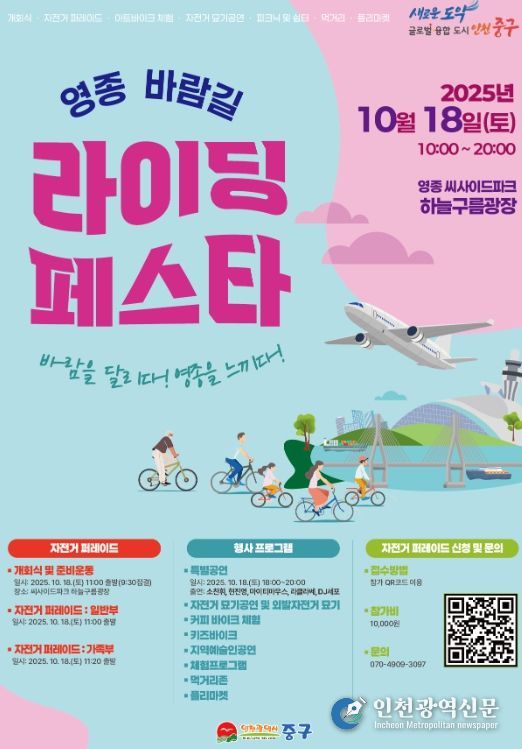 [인천광역신문] 최예준 기자 | 인천시 중구는 축제의 계절 가을을 맞아 오는 18일 영종 씨사이드파크 일원에서 ‘영종 바람길 라이딩 페스타’를 개최한다.