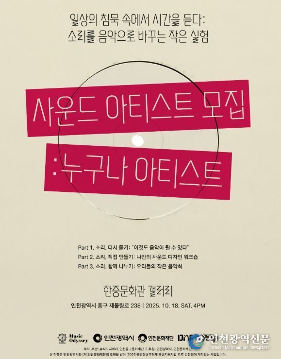 [인천광역신문] 최예준 기자 | (재)인천중구문화재단은 상주단체 ‘뮤직오디세이’의 시민참여 퍼블릭프로그램 〈일상의 침묵 속에서 시간을 듣다'에 함께할 참가자를 선착순 모집한다고 1일 밝혔다.