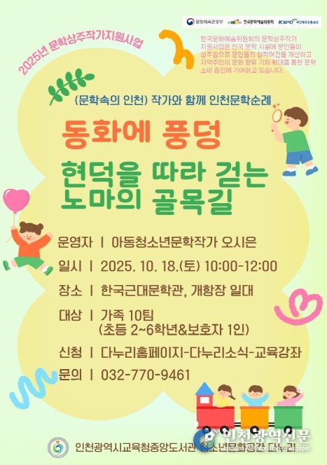 [인천광역신문] 최예준 기자 | 인천광역시교육청중앙도서관은 10월 18일 오전 10시부터 12시까지 오시은 상주작가와 함께하는 인천문학순례를 운영한다.