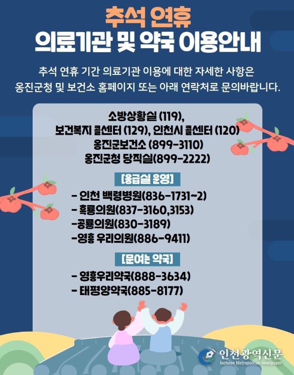 연휴 중 문을 여는 병·의원과 약국 정보는 국번 없이 ▲129(보건복지콜센터), ▲119(구급상황관리센터), ▲응급의료포털, ▲스마트폰 애플리케이션 ‘응급의료정보제공’ 및 ‘응급똑똑’, ▲옹진군청(옹진군보건소) 홈페이지에서 확인할 수 있다.