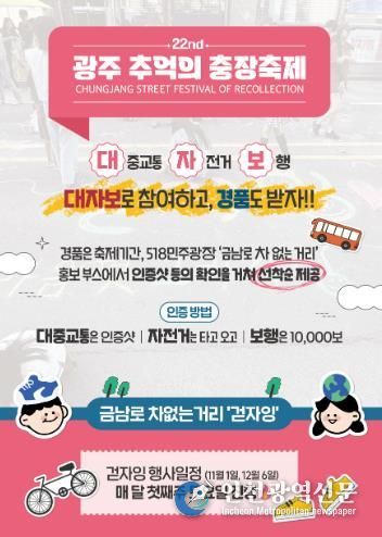[인천광역신문] 관리자 기자 | 광주 동구는 오는 15일부터 5일간 금남로와 충장로 일원에서 열리는 제22회 광주 추억의 충장축제에서 ‘금남로 차 없는 거리’의 가치를 알리고 대자보 도시 정책에 시민 참여를 확대하기 위한 특별 홍보 이벤트를 진행한다고 밝혔다.