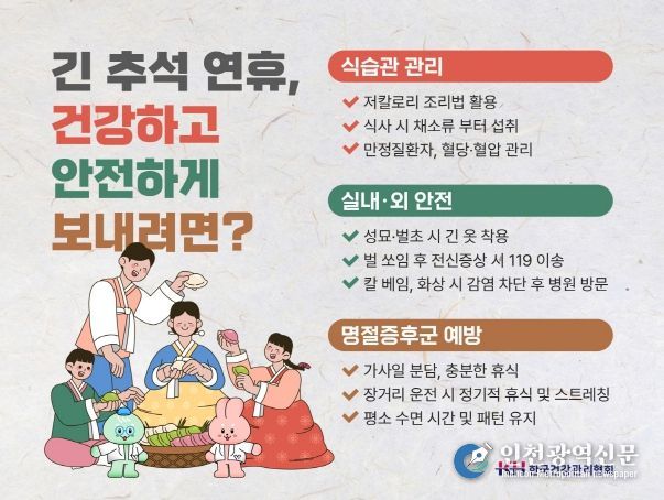 [인천광역신문] 최예준 기자 | 민족 최대의 명절 추석을 앞두고 있다. 긴 귀성·귀경길 운전, 과식을 유발하는 명절 음식, 그리고 집중적인 가사 노동 등은 신체에 예상치 못한 부담을 줄 수 있어 주의가 필요하다.
