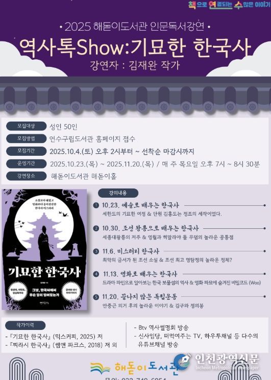 [인천광역신문] 최예준 기자 | 연수구 해돋이도서관은 인문 독서 강연 ‘역사톡Show:기묘한 한국사’ 프로그램 참여자를 모집한다.