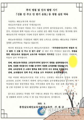 [인천광역신문] 관리자 기자 | 충청남도태안교육지원청은 추석 연휴 시기를 맞아 청렴한 공직문화를 확산하기 위해 ‘선물 안 주고 안 받기 운동’을 강조하는 청렴 서한문을 홈페이지에 게시했다.
