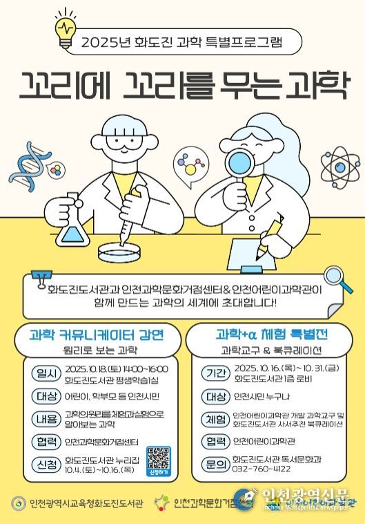 [인천광역신문] 최예준 기자 | 인천광역시교육청화도진도서관은 지역사회의 과학문화 확산을 도모하기 위하여 오는 10월 16일부터 31일까지 인천시민 대상‘꼬리에 꼬리를 무는 과학’을 운영한다.