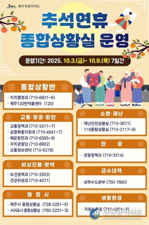 추석 연휴 중 불편사항이나 비상상황 발생 시 도청 종합상황실 또는 제주 만덕콜센터로 연락하면 된다.