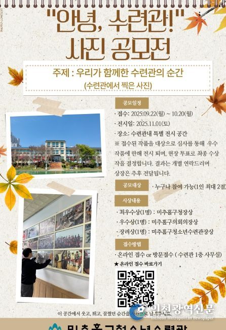[인천광역신문] 최예준 기자 | 인천 미추홀구청소년수련관은 수련관 이전을 앞두고 지난 30여 년간의 추억을 함께 기록하기 위해 ‘안녕, 수련관’ 사진 공모전을 진행하고 있다고 2일 밝혔다.