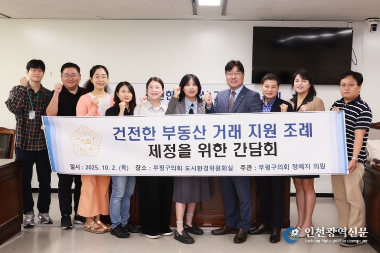 [인천광역신문] 최예준 기자 | 인천 부평구의회 정예지 의원(더불어민주당 비례)은 지난 10월 2일 부평구의회 도시환경위원회실에서 '인천광역시부평구 건전한 부동산 거래 지원 조례'제정을 위한 간담회를 개최했다.