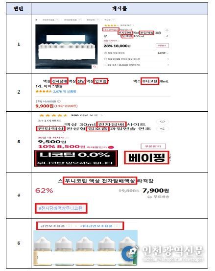 [인천광역신문] 관리자 기자 | 식품의약품안전처는 시중에서 판매되는 ‘무니코틴 표방 액상 흡입제품’에 대해 ‘의약외품(니코틴이 포함되지 않은 흡연욕구저하제, 흡연습관개선보조제)’ 오인 우려 광고로 보아 지난 9월 집중 점검을 실시했다.