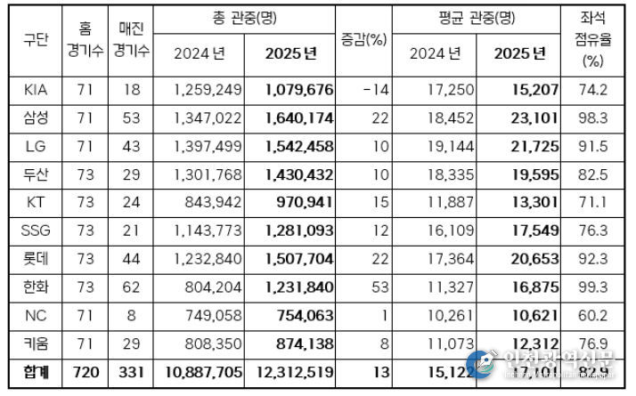 최종적으로 2025시즌은 지난 시즌 보다 약 13% 증가한 1,231만 2,519명의 관중이 입장하며 평균 관중 1만 7,101명을 기록했다. 전체 경기 수의 약 46%인 331경기가 매진됐고, 좌석 점유율 또한 82.9%를 기록했다.