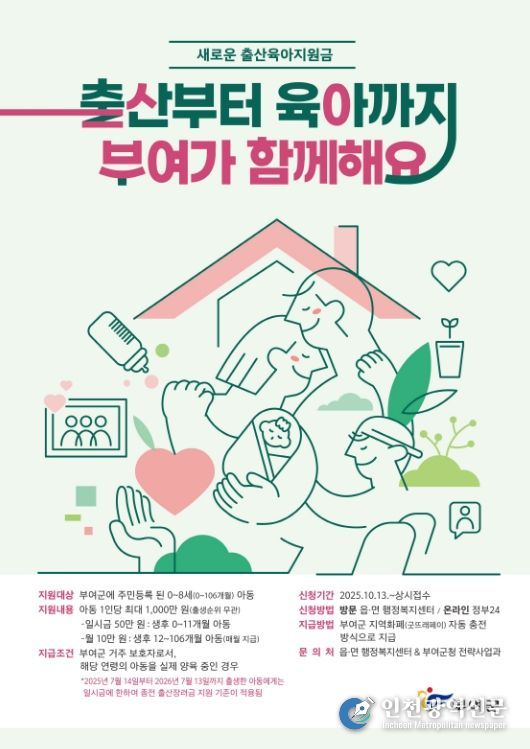 [인천광역신문] 관리자 기자 | 부여군이 저출산 위기에 대응하기 위해 기존 출산장려금 제도를 ‘출산육아지원금’으로 전면 개편하고, 오는 10월 13일부터 신청을 시작한다.