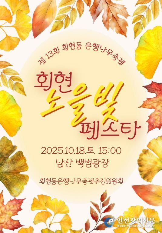 [인천광역신문] 최훈 기자 | 제13회 회현동 은행나무축제 '회현 노을빛 페스타'가 오는 18일 오후 3시부터 7시까지 남산 백범광장에서 열린다.