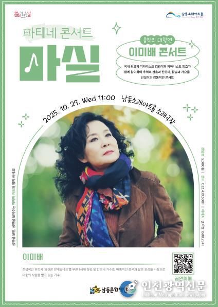 [인천광역신문] 최예준 기자 | 인천시 남동구 남동문화재단은 남동소래아트홀의 대표 상설 프로그램인 ‘마티네콘서트 마실’로 ‘이미배 콘서트’를 10월 29일 개최한다고 10일 전했다.
